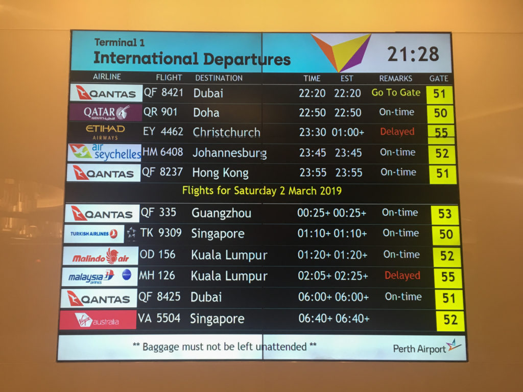Unser Flug von Perth hat Verspätung. So wird aus einem Abflug kurz vor Mitternacht fast zwei Uhr morgens.