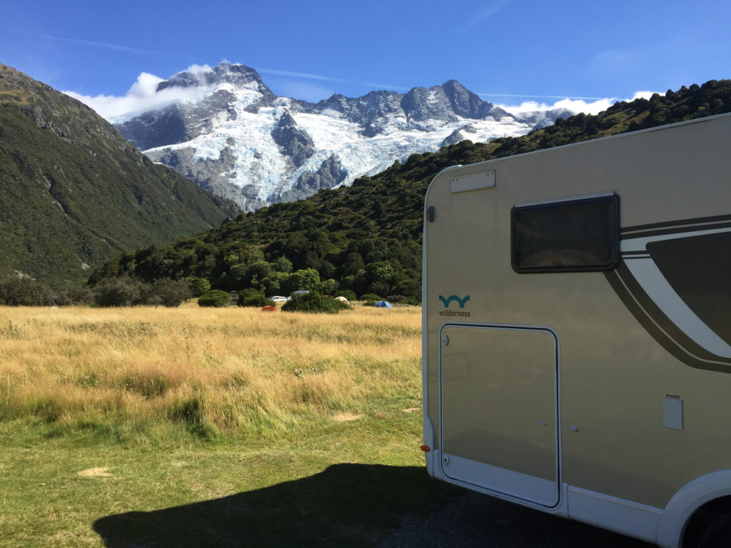 Auf der Fahrt zum Mount Cook Village kommen beim Anblick der Berge fast Heimatgefühle auf, das haben wir echt vermisst. Der White Horse Hill DOC Campground liegt direkt am Fuss der Berge und ist entsprechend beliebt. Auch hier ist ab dem späten Nachmittag Platz Mangelware. Die Naturschutzbehörde (Department of Conservation, kurz DOC) betreibt in ganz Neuseeland Campingplätze in unterschiedlichen Kategorien. Je nach Ausstattung und Lage variiert der Übernachtungspreis. White Horse Hill gehört zu den «Scenic» Plätzen und kostet daher NZD 32.50 für zwei Erwachsene und ein Kind (Paul zahlt noch nichts). Absolut in Ordnung, wie wir finden.