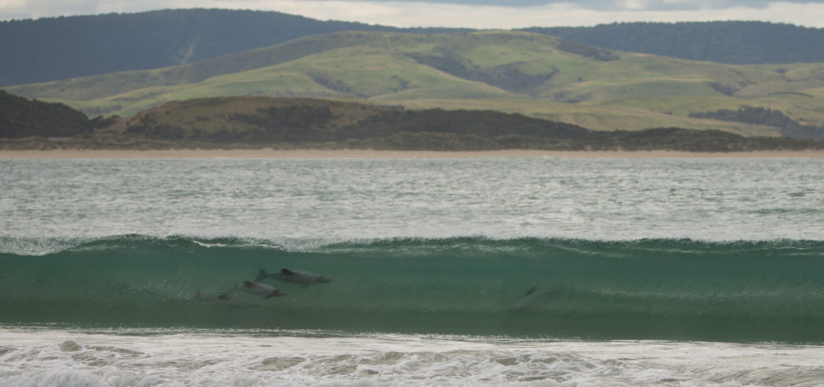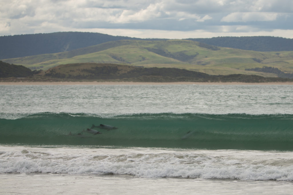 Die nächsten zwei Nächte verbringen wir in Curio Bay, für viele das Highlight der Catlins. Es ist aber auch schön hier und wir haben dazu noch den Wettergott bestochen und zwei absolute Traumtage. Der Campingplatz liegt genau zwischen der Curio Bay, Heimat einer Gelbaugenpinguin Kolonie und der Porpoise Bay, einem unendlich langen Sandstrand. Das Sahnehäubchen sind allerdings die Hector-Delfine, welche hier regelmässig in den Wellen surfen.