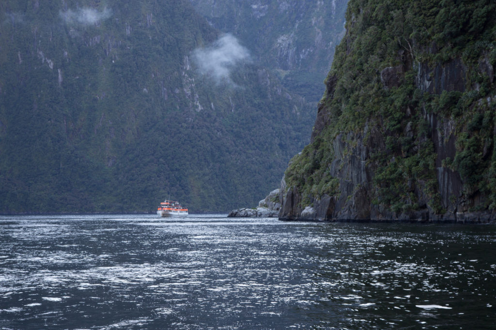 Vor uns liegen 45 km Kurven, zunächst bergauf bis zum Homer Tunnel auf 945 m, um dann auf den letzten 20 km wieder auf Meereshöhe zu kommen. Wohl dem, der gute Bremsen hat. Wir finden dieses Stück Strasse spektakulär und könnten alle 50 m anhalten, um ein Foto zu machen. Dafür haben wir aber keine Zeit, denn um 9 Uhr startet unser Cruise. Wir haben uns für die erste Fahrt des Tages mit Mitre Peak, einem Anbieter mit kleinen Booten, entschieden. Goldrichtig, wie wir finden. Die Reisebusse aus Te Anau und Queenstown (es gibt 28 Parkbuchten vor dem Terminal!) kommen erst später am Tag und so geniesst man den Fjord mit relativ wenigen Leuten. Es ist keine Wolke am Himmel zu sehen und die Sonne schiebt sich gerade über die Berge.