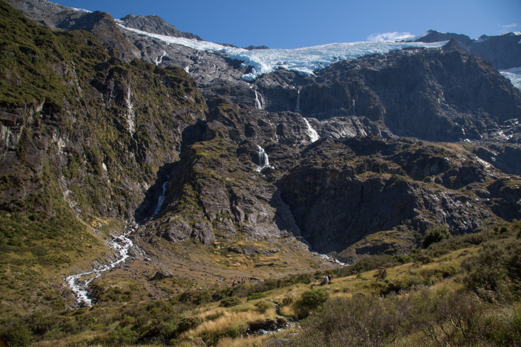 Der letzte Kilometer führt über Geröll und teilweise auch grössere Felsen zum oberen Aussichtspunkt und hier sind wir einmal mehr sprachlos – vor uns der Gletscher und überall Wasserfälle, die an den Felsen ins Tal stürzen.