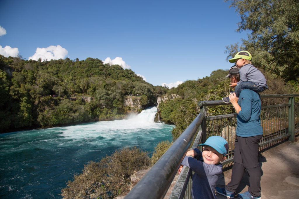 Taupo lassen wir links liegen und fahren weiter Richtung Norden. Einen kurzen Halt an den Huka Falls machen wir aber noch. Der Waikato, der normalerweise 100 Meter breit ist, wird hier durch eine ca. 15 Meter breite Stelle gepresst.