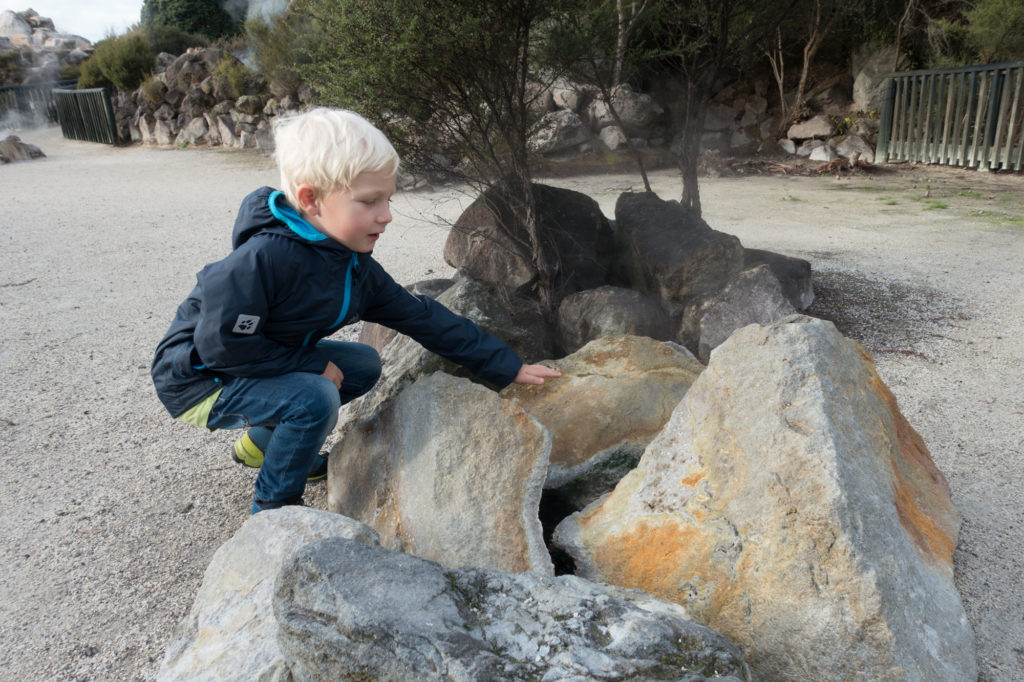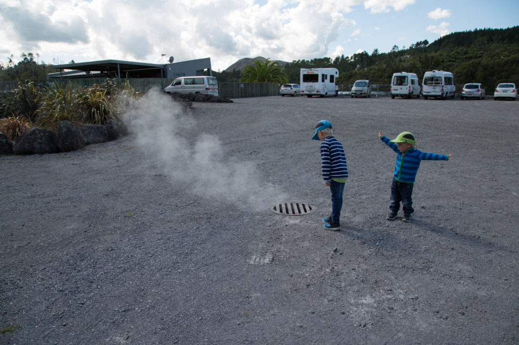 Eigentlich wollten wir heute noch Richtung Küste aufbrechen, aber als wir wieder auf dem Parkplatz sind, steht dort ein bekanntes Wohnmobil. Die Flawiler Familie ist auch da. An eine Weiterfahrt ist nicht mehr zu denken. So beschliessen wir, alle zusammen Richtung Stadtpark zu laufen. Natürlich fängt es an, in Strömen zu regnen und wir bereuen unseren Entscheid bereits wieder. Dann hat der Wettergott aber Erbarmen und wir können die Regenjacken wegpacken. Im Kuirau Park gibt es ebenfalls unzählige dampfende Erdlöcher. Die Kinder springen aufgeregt von einem zum anderen. Teilweise sind sie auch nicht einmal umzäunt.