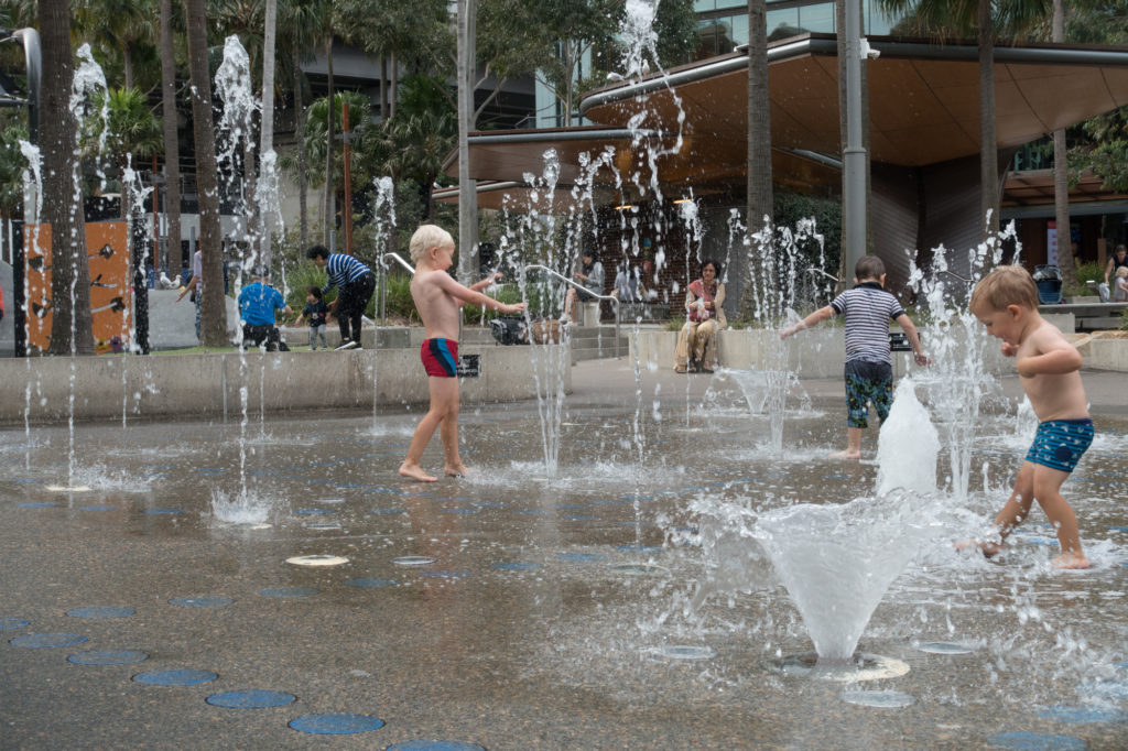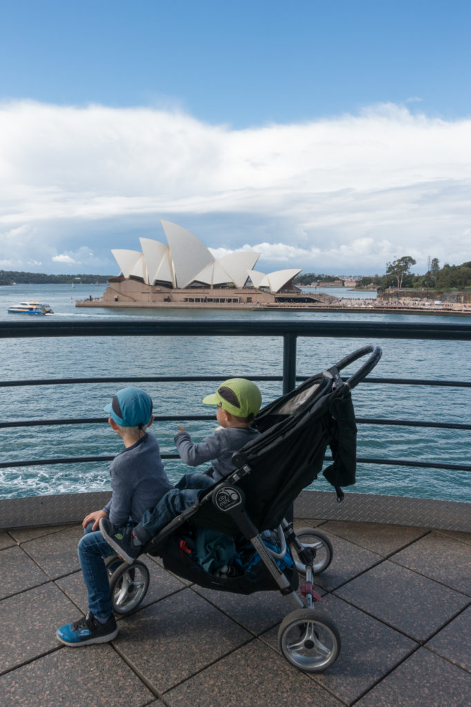 Eine Woche Zeit haben wir, um Australiens „heimliche Hauptstadt“ zu erkunden. Erstes Ziel – der Darling Harbour Spielplatz. Obwohl es bewölkt ist, sind die zwei Rabauken nicht davon abzuhalten, auch den Wasserspielplatz zu erobern,