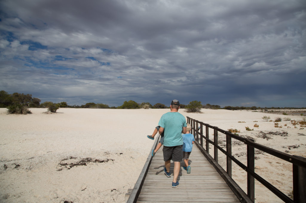 Gegen Abend lässt der Wind komplett nach und wir bauen vergnügt unser Dachzelt auf und betten uns zur Ruhe. Allerdings nur bis etwa 22 Uhr, der Wind bläst wieder so stark, dass Werner das Dachzelt abbaut und wir zu viert in unserem Bodenzelt kuscheln. Die Jungs staunen am Morgen nicht schlecht, sie haben einfach die ganze Aufregung verschlafen. Als wir dem Cape Peron noch einen Besuch abstatten, treffen wir eine australische Familie, welche uns erklärt was die Abkürzung WA wirklich bedeutet. Nicht Western Australia sondern Windy Always!