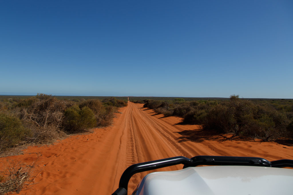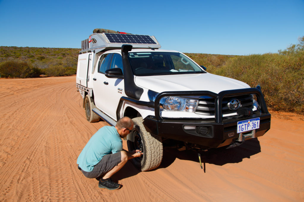 Die Nacht ist windig und der folgende Morgen noch viel mehr. Wir überlegen hin und her, ob wir im Francois Peron Nationalpark übernachten sollen. Die Campingplätze liegen alle an der Küste und sollte der Wind nicht nachlassen, wird das keine schöne Erfahrung. Die Camping Gebühren müssen am Parkeingang gezahlt werden, danach folgen 60 Kilometer Sandpiste bis zum Cape Peron. Wir vertrauen auf den Wetterbericht und ziehen los. Nicht, ohne vorher noch den Reifendruck entsprechend ab zu senken.