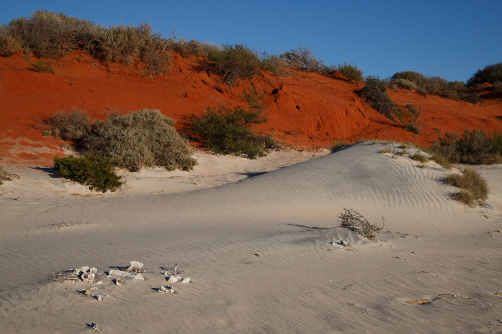Nur zum Baden im türkisblauen Wasser ist es auf Grund des starken Windes leider viel zu kalt. Vielleicht auch gut so, denn neben Haien gibt es hier auch Steinfische, denen wir lieber nicht begegnen wollen. Thomas in Perth meinte, die Schmerzen sollen sechs mal schlimmer als bei einer Geburt sein. Da verzichte ich dankend. Wir halten an den verschiedenen Campingplätzen, entscheiden uns dann für Bottle Bay. Unser Stellplatz liegt direkt hinter den Dünen und bietet viel roten Sand zum Spielen. Am Skipjack Point könnte man eigentlich Haie, Rochen, Delfine und mit Glück sogar Dugongs im seichten Wasser beobachten, Leider ist es im Moment eher eine stürmische See. So geniessen wir lieber unseren Privatstrand, denn mit uns sind nur drei andere Camper hier.