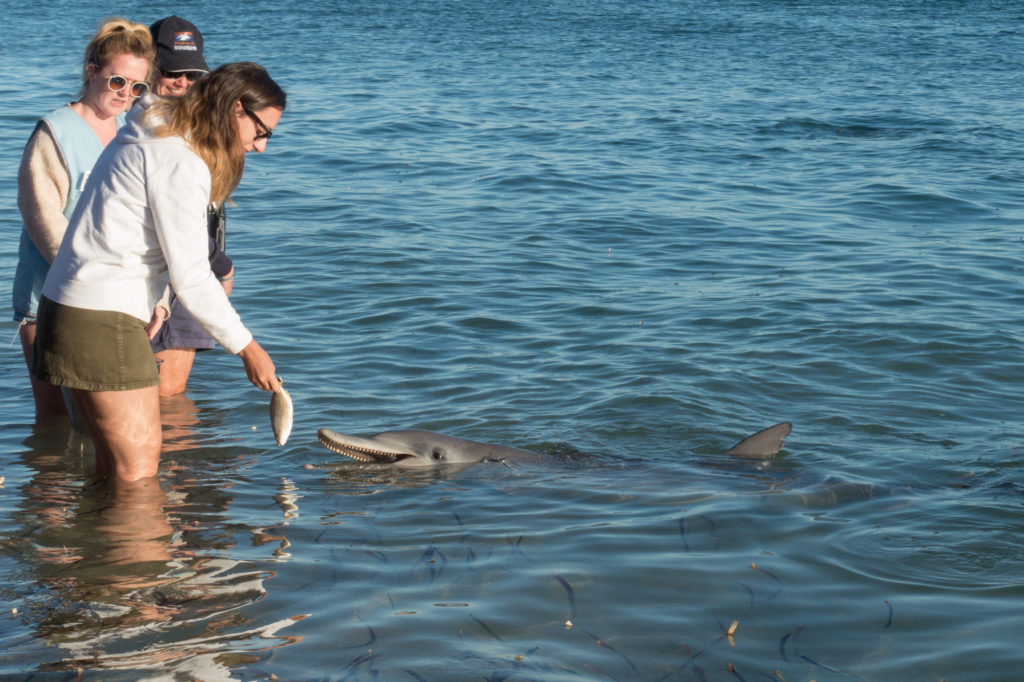 Wir pumpen die Reifen wieder auf und queren die Halbinsel, um nach Monkey Mia zu kommen. Der Ort ist bekannt für seine wilden Delfine, die jeden Morgen an den Strand kommen, um sich mit Fisch füttern zu lassen. Das Ganze wird streng von der Nationalparkbehörde kontrolliert. Der Kontrast zur letzten Nacht könnte nicht grösser sein, aber es gibt einen tollen Spielplatz, zwei Pools und eine der besten Campingküchen, die wir bis jetzt gesehen haben. Am nächsten Morgen heisst es dann aber zeitig auf stehen, denn die erste der drei Fütterungen ist um 7:45 Uhr. Wir stehen dicht an dicht am Strand, aber die Rangerin erklärt, dass es eine kleine Gruppe ist. Einmal waren 740 Menschen anwesend! Es gibt einige wissenswerte Fakten über die Delfine und dann werden sechs Leute aus dem Publikum ausgewählt, die je einen Fisch verfüttern dürfen.