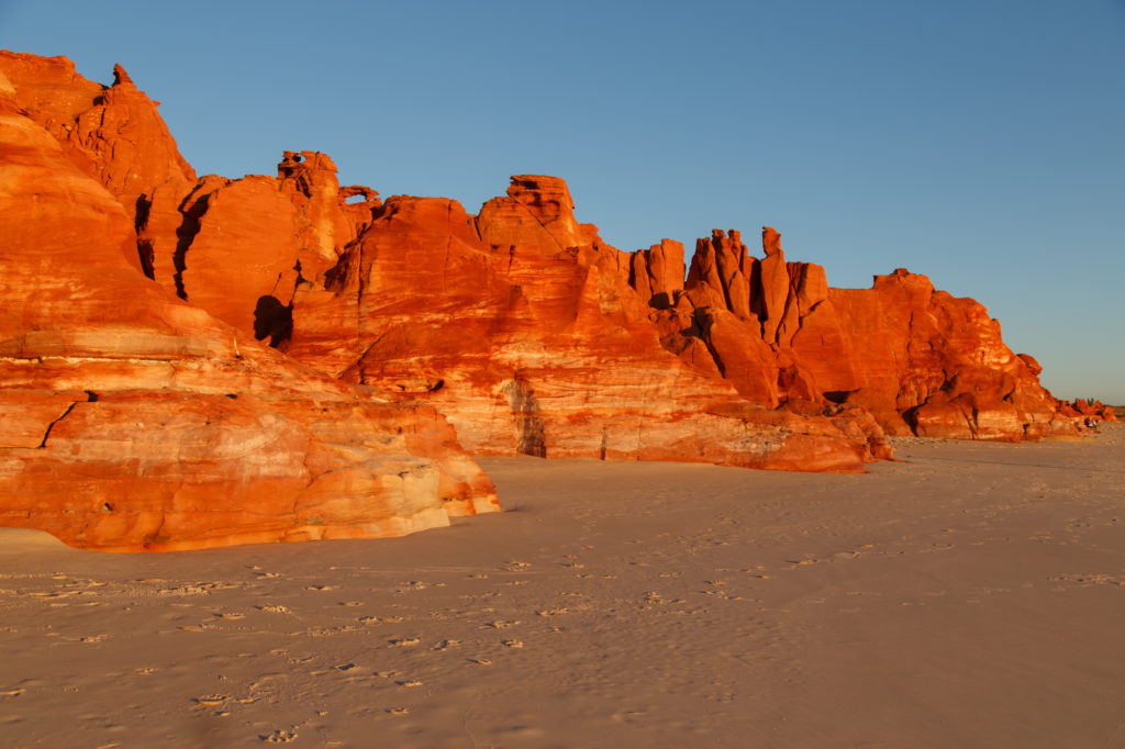 Bevor wir Richtung Darwin aufbrechen, fahren wir noch zwei Tage auf die Dampier Peninsula nördlich von Broome. Zwischen uns und Kooljaman liegen 200 Kilometer, davon die Hälfte ungeteert. Die tiefrote Piste stellt sich jedoch als harmlos heraus. Spätestens Ende nächstes Jahr soll dann die gesamte Strecke asphaltiert sein. Wir campen direkt am Strand, zum Glück dem ohne Haie. Am Western Beach sollte man das Baden lieber unterlassen. Dafür gibt es hier grandiose Sonnenuntergänge, die die roten Felsen förmlich glühen lassen.
