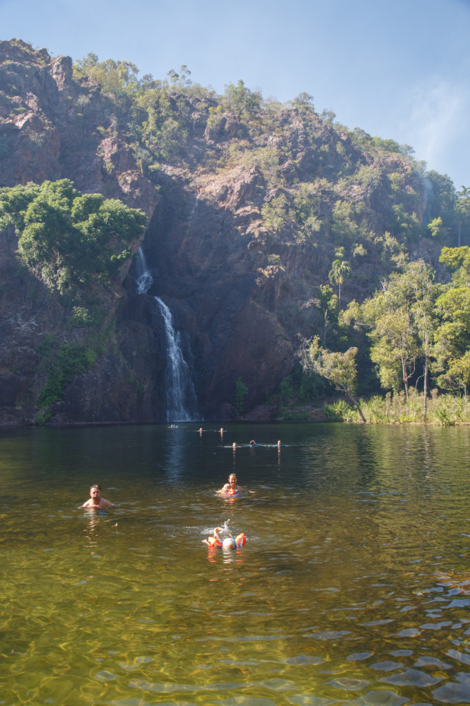 Bis zum nächsten Ziel, dem Litchfield Nationalpark sind es über 300 Kilometer. Wir legen einen kurzen Versorgungsstopp in Humpty Doo (ja, der Ort heisst wirklich so) ein, fahren aber sonst zügig durch. Die Campingplätze im Nationalpark sind äusserst begehrt und so ist um 13 Uhr der erste Platz, den wir ansteuern auch schon komplett voll. Unsere Hoffnungen sinken und wir sehen uns schon 30 Kilometer zurück zur nächsten Ortschaft fahren. Aber wir haben Glück und bekommen ein feines Plätzchen auf dem Florence Falls 4WD Camping.