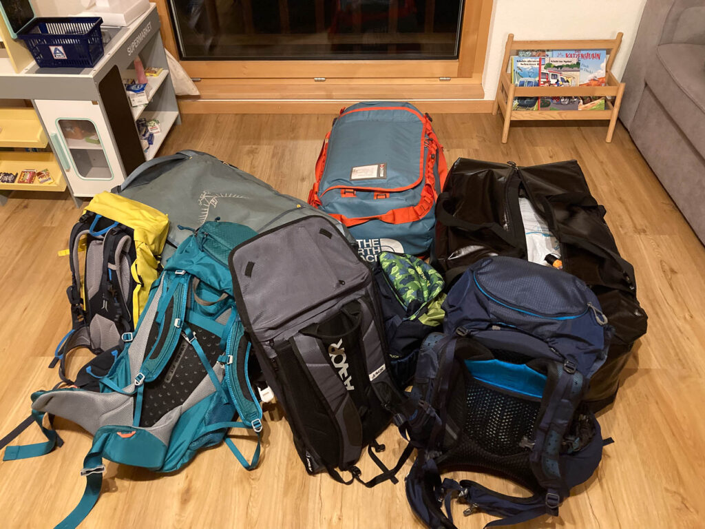 Unser Gepäck quetschen wir in drei Reisetaschen und fünf Handgepäckrucksäcke.