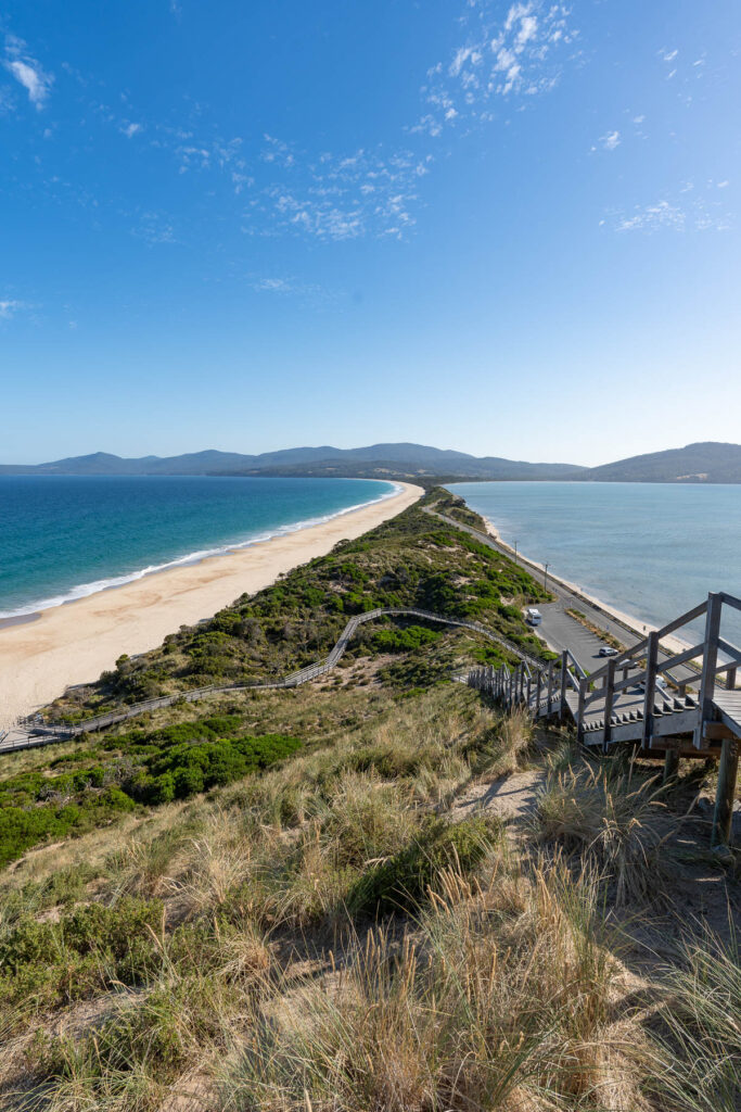 Die Abendstimmung ist herrlich und so halten wir noch am Neck Reserve, dem Aussichtspunkt schlechthin auf der Insel. Sie besteht nämlich aus zwei Hälften, die über eine schmale Landenge (The Neck) miteinander verbunden sind. Fast das gesamte touristische Geschehen spielt sich im Süden ab, vieles ist aber nur über gravel roads zu erreichen und damit für uns tabu.