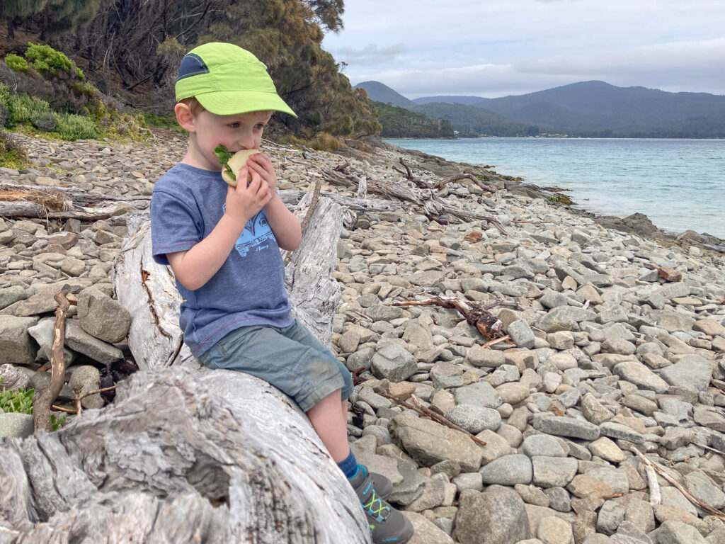 Verständlicherweise hat Charlie keine Lust mehr. Aber mit ein paar Gummibärchen lässt er sich doch zum Weiterlaufen motivieren. Jetzt geht es zum Glück durch den Wald bergab in Richtung Adventure Bay. Und der kleine Kerl läuft doch tatsächlich die gesamte Strecke (bis auf ein paar Meter am steilen Anstieg zu den Klippen) selbst. Super gemacht Charlie.