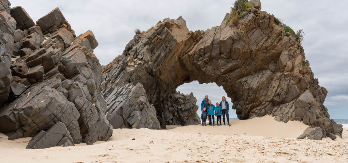 Am Strand müssen wir aufpassen, dass wir ohne nasse Füsse um zwei Felsspitzen herum kommen und dann haben wir nach 2.5 km den Felsbogen gefunden.