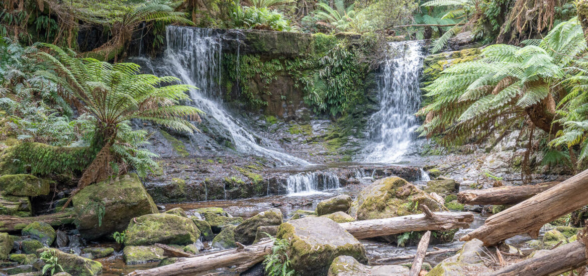 Nachdem wir uns durch eine Stunde Schulstoff gequält haben, laufen wir noch den kurzen Weg zu den Russell Falls.