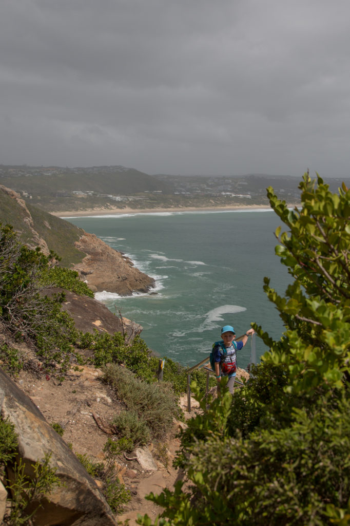 Am darauffolgenden Tag erkunden wir das Robberg Nature Reserve. Auf der Halbinsel in Plettenberg Bay gibt es drei unterschiedlich lange Wanderwege. Wir entscheiden uns für die mittlere Version Witsand. 5,5 km gilt es zu bewältigen. Wir kommen wie immer später als geplant los und starten so erst gegen 10 Uhr. Schon auf den ersten Metern, die noch über einen Boardwalk führen, kommen wir ins Schwitzen. Dann geht es immer stetig bergauf. Besonders steile Stellen sind mit einem Geländer gesichert, worüber ich sehr froh bin, denn Henry springt wie immer voraus.
