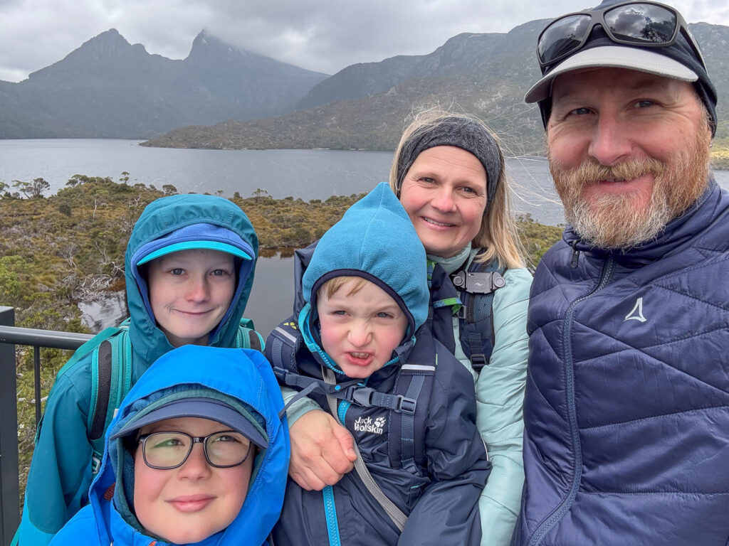 Immerhin haben wir so fast alle Kleidungsstücke aus dem Rucksack gebraucht. Die Wanderung hat uns wirklich gut gefallen und wir sind stolz auf Charlie, der alles allein gelaufen ist. Zur Belohnung gibt es dann doch noch ein paar Sonnenstrahlen an dem Fotospot schlechthin. Wir amüsieren uns köstlich mit einem Australier, der wie ein Rohrspatz schimpft, weil ihm immer wieder einer ins Bild läuft. Später stellt sich heraus, dass er unser Campingnachbar ist.