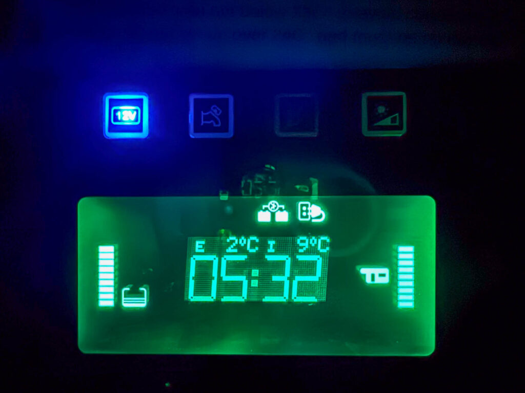In der Nacht zeigt unser Display nur noch 2 Grad Aussentemperatur. Wir haben die Wahl zwischen Frieren und dem Höllenlärm der Klimaanlage.