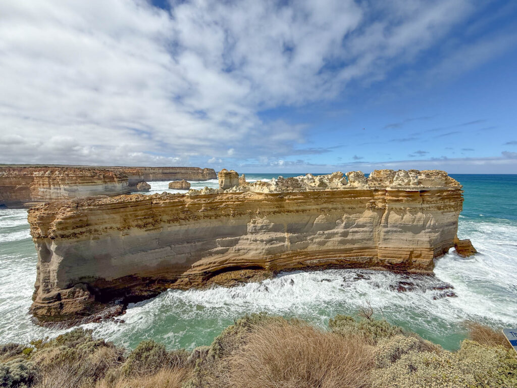 Als wir Bimbi Park verlassen, hängen die Wolken tief und es fängt sogar an zu regnen. Bis wir die Shipwreck Coast erreichen, kommt die Sonne zum Glück wieder zum Vorschein. Hier beginnt mit den Twelve Apostles der bekannteste Teil der Küstenstrasse. Der Name ist etwas irreführend, denn es gab nie zwölf Kalksteinfelsen, sondern nur neun. Jetzt sind noch sieben übrig. Sie sollen nach dem Uluru die am zweitmeisten fotografierte Touristenattraktion Australiens sein. Heute kommen wohl allein von uns mindestens 100 Fotos hinzu.
