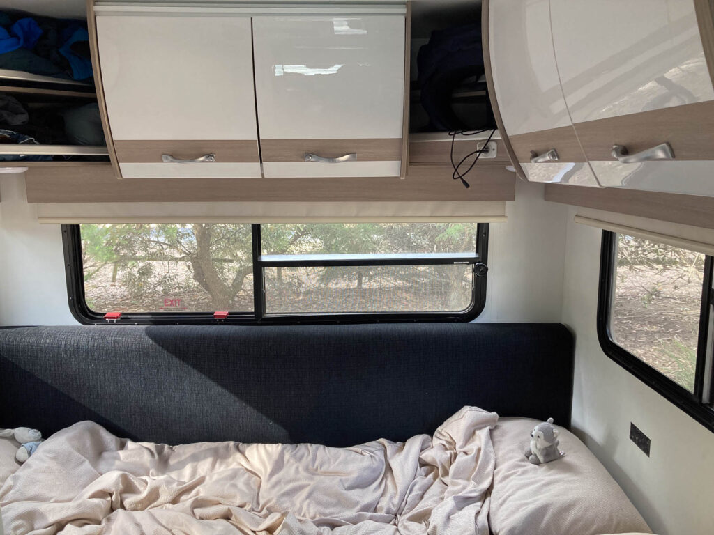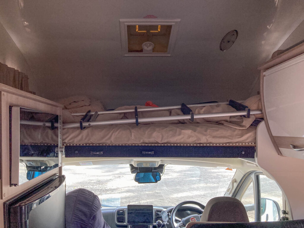Das hintere Bett kann man zu einer weiteren Sitzgruppe umbauen, was wir nutzen, wenn das Wetter schlecht ist oder Schulaufgaben erledigt werden müssen. Da sind wir froh, uns gegen ein Wohnmobil mit zwei Festbetten entschieden zu haben. Die Sorge, dass das Bett unbequem ist, weil die „Matratze“ aus den einzelnen Polstern besteht, war unbegründet. Da hadert Werner schon mehr mit dem Alkoven.