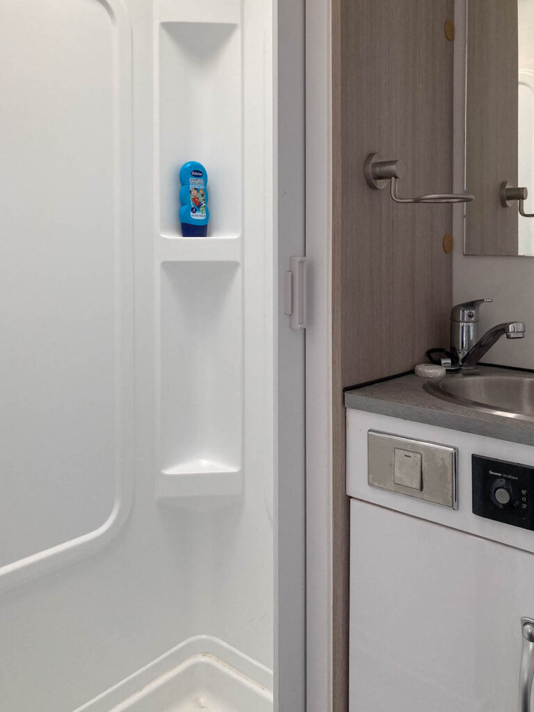Der Wellnessbereich darf natürlich nicht fehlen. Die Dusche ist vom Rest der Nasszelle getrennt, was sie auch nutzbar macht. Kein Duschklo, wie ich es von früheren Wohnmobilurlauben kenne. Die Dusche haben wir bis jetzt vor allem auf Buschcampings ohne Einrichtungen oder auf Campingplätzen, wo man extra fürs Duschen zahlen muss, genutzt.