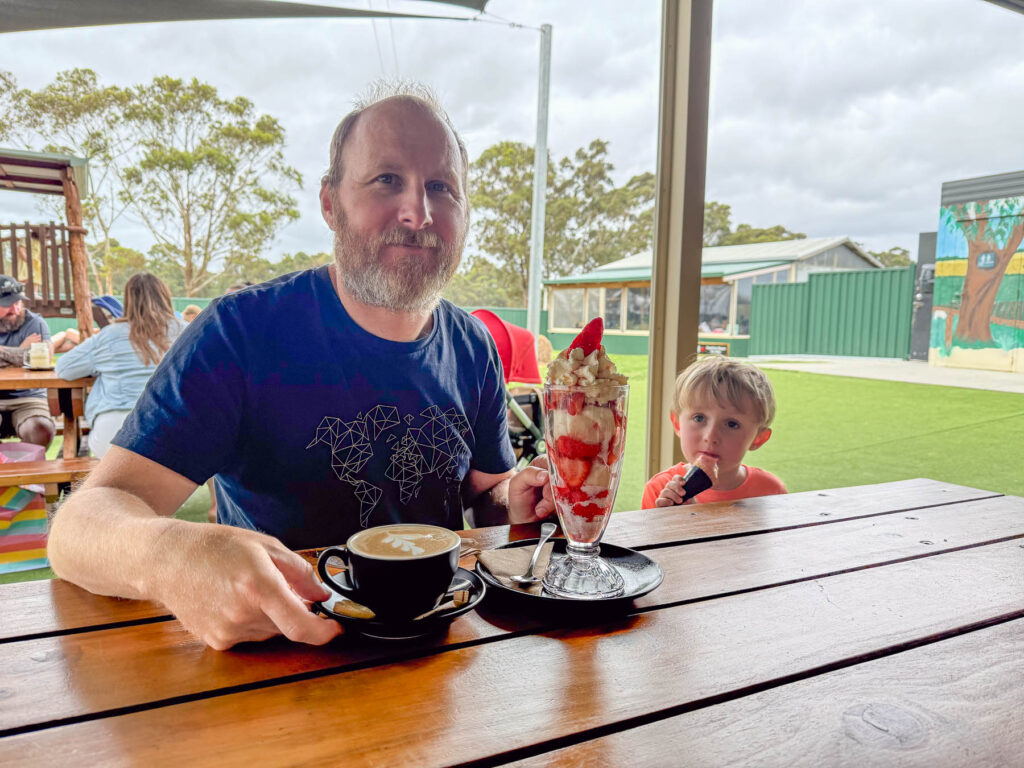 So essen wir unser Picknick an einem Lookout unterhalb vom Felsen und machen uns dann auf den Rückweg nach Albany. Zur Belohnung halten wir an einer Erdbeerfarm mit Café und Spielplatz.