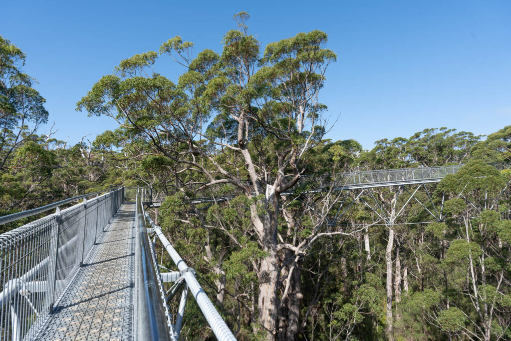 Unser Tagesziel ist Walepole, das in mitten der riesigen Karriwälder liegt. Diese Baumgiganten werden bis zu 85 Meter hoch, haben aber ein äusserst empfindliches Wurzelsystem. So wurde nach einem Weg gesucht, die Bäume den Menschen zugänglich zu machen, ohne dass sie dabei geschädigt werden. So entstand der Valley of the Giants Tree Top Walk. In bis zu 40 Metern Höhe läuft man hier auf Stahlkonstruktionen durch die Baumkronen. Da fühlt man sich wie ein Zwerg.