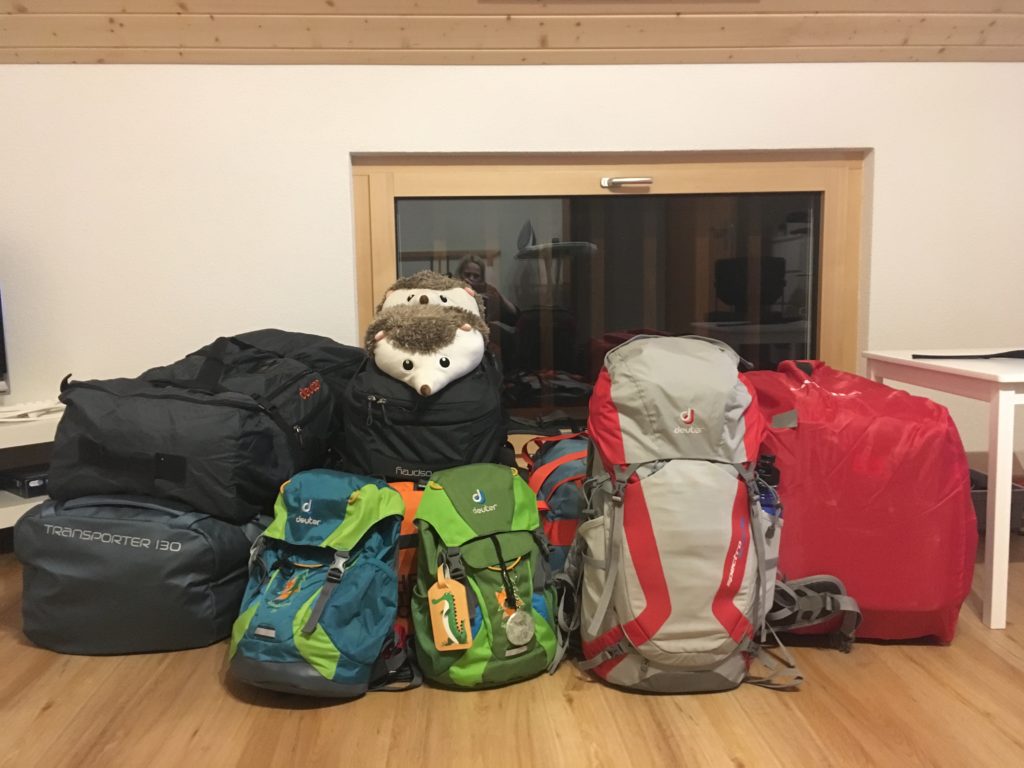 Wie zu Erwarten finden natürlich nicht alle Gegenstände auf der langen Packliste in den drei bereit gelegten Taschen Platz. Also muss jetzt doch die vierte Tasche für Paul’s Kraxe zum Einsatz kommen. Wir haben uns für Reisetaschen entschieden, da diese im Camper am Besten zu verstauen sind und wir die meiste Zeit mit fahrbarem Untersatz unterwegs sein werden.