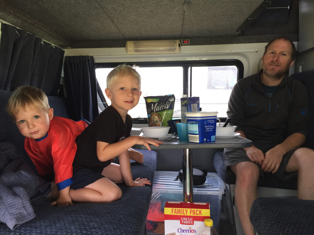 Am nächsten Morgen ist alles wolkenverhangen und es regnet sogar ein wenig. Henry freut das sehr, denn endlich kann er im Camper frühstücken.
