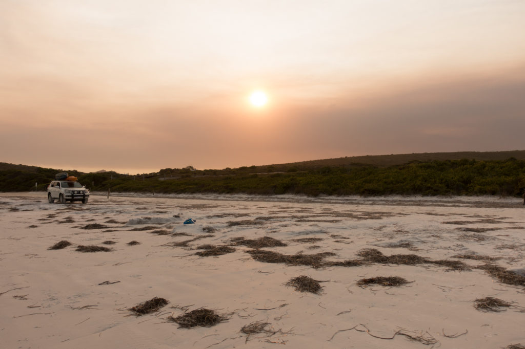 Dann bemerken wir am Horizont schwarze Rauchwolken, schnell wird klar, dass es sich um einen Buschbrand handelt. Die Ranger wollen am Nachmittag entscheiden, ob der Campingplatz evakuiert werden muss. Das wäre wirklich sehr schade, denn morgen hat Werner Geburtstag. Doch wir haben Glück und dürfen noch eine Nacht bleiben. Allerdings sind sämtliche anderen Strände und Wege im Nationalpark bereits geschlossen.
