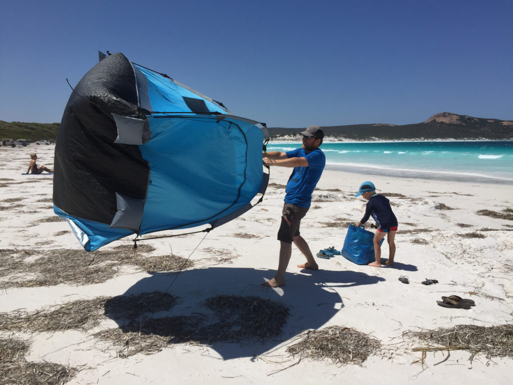 Dann steht mal wieder einer der ungeliebten Admin Tage an. Wäsche waschen, Einkaufen, kleine Reparaturen. Die Fahrt in den Cape Le Grand Nationalpark dauert nur eine Stunde und so sind wir am nächsten Morgen recht zeitig am Lucky Bay Campground. Da ist sie also – die berühmte Bucht mit den Kängurus am Strand. Die Lage und Ausstattung ist fantastisch, kein Wunder, dass es fast unmöglich ist, hier unter zu kommen. Es gibt sogar heisse Duschen. Zunächst machen wir aber Bekanntschaft mit dem Wind, der hier fast immer an der Tagesordnung ist.