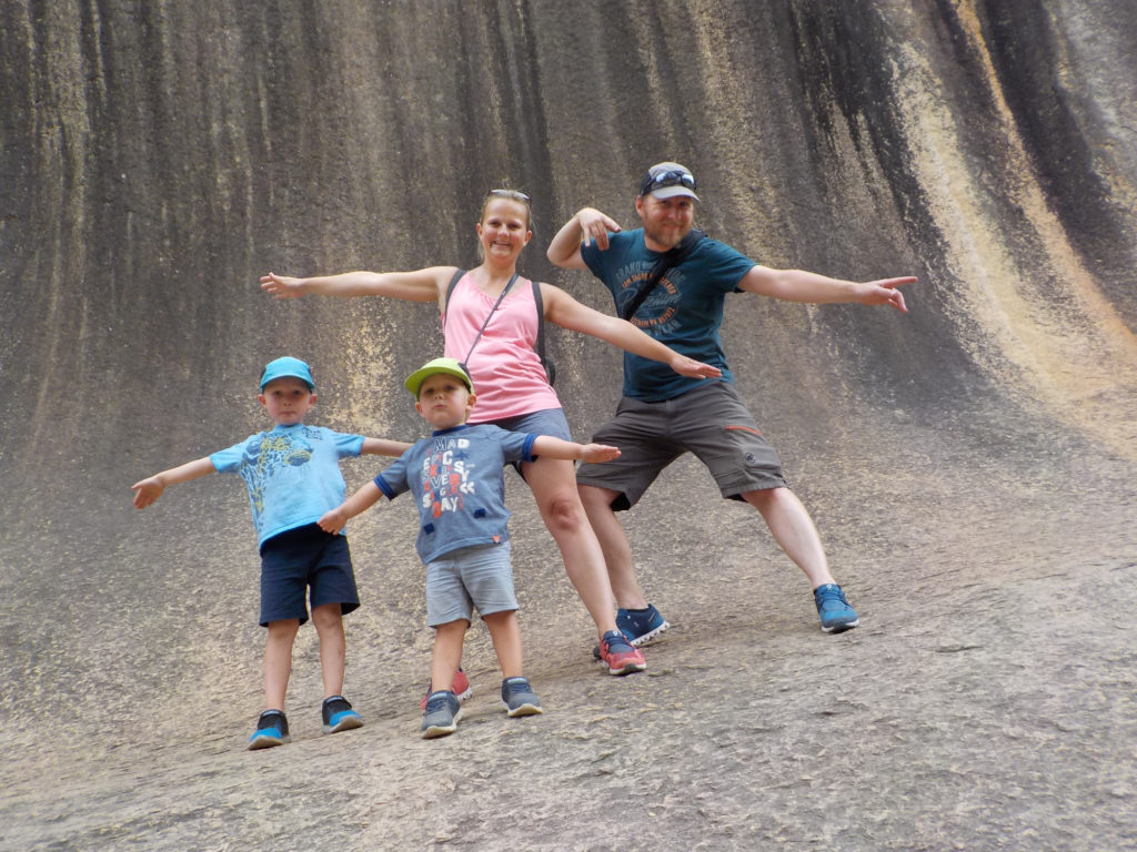 Auf der langen Rückfahrt nach Perth legen wir einen Zwischenstopp in Hyden am Wave Rock ein. Auch hier gefällt es uns ausgesprochen gut. Es ist aber das erste Mal auf unserer Reise hier in Australien so richtig heiss und wir sind froh um den Swimming Pool. Ein Besuch beim Felsen, der die Form einer riesigen Welle (daher auch der Name) hat, darf natürlich nicht fehlen. Hier erleben wir die Instagram Influencer in Aktion – eine Gruppe Chinesen braucht geschätzt eine Stunde für Fotos in jeglicher Position und nervt uns gewaltig. Henry hat aber sowieso seine ganz eigenen Vorstellungen, wie unser Foto auszusehen hat.