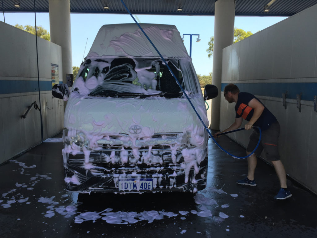 Vor der Abgabe muss Herbert noch vom Staub der letzten Wochen befreit werden und wir gönnen ihm die Luxusbehandlung mit rosa Schaum.