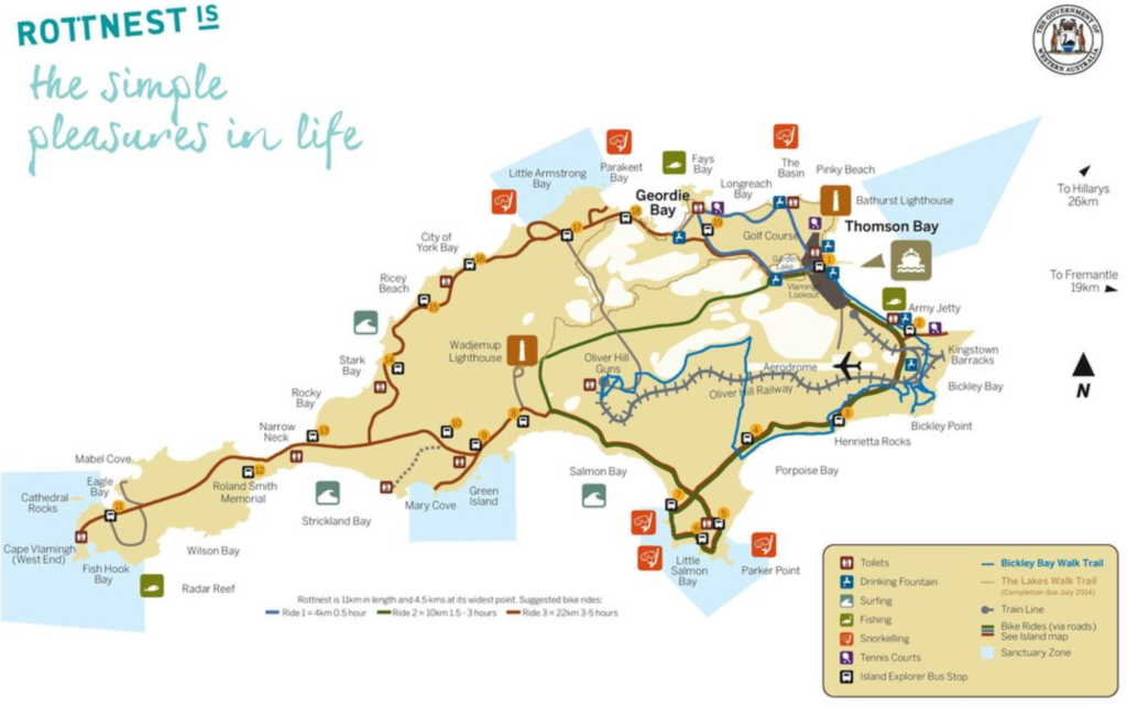 Am Mittwoch machen wir einen Ausflug nach Rottnest Island. Die autofreie Insel ist innerhalb von 30 Minuten mit der Fähre zu erreichen. Rottnest Island ist 11 km lang und maximal 4.5 km breit und kann daher perfekt mit dem Fahrrad erkundet werden. Also leihen wir uns Drahtesel aus und machen uns auf die mittlere, 11 km lange Strecke.